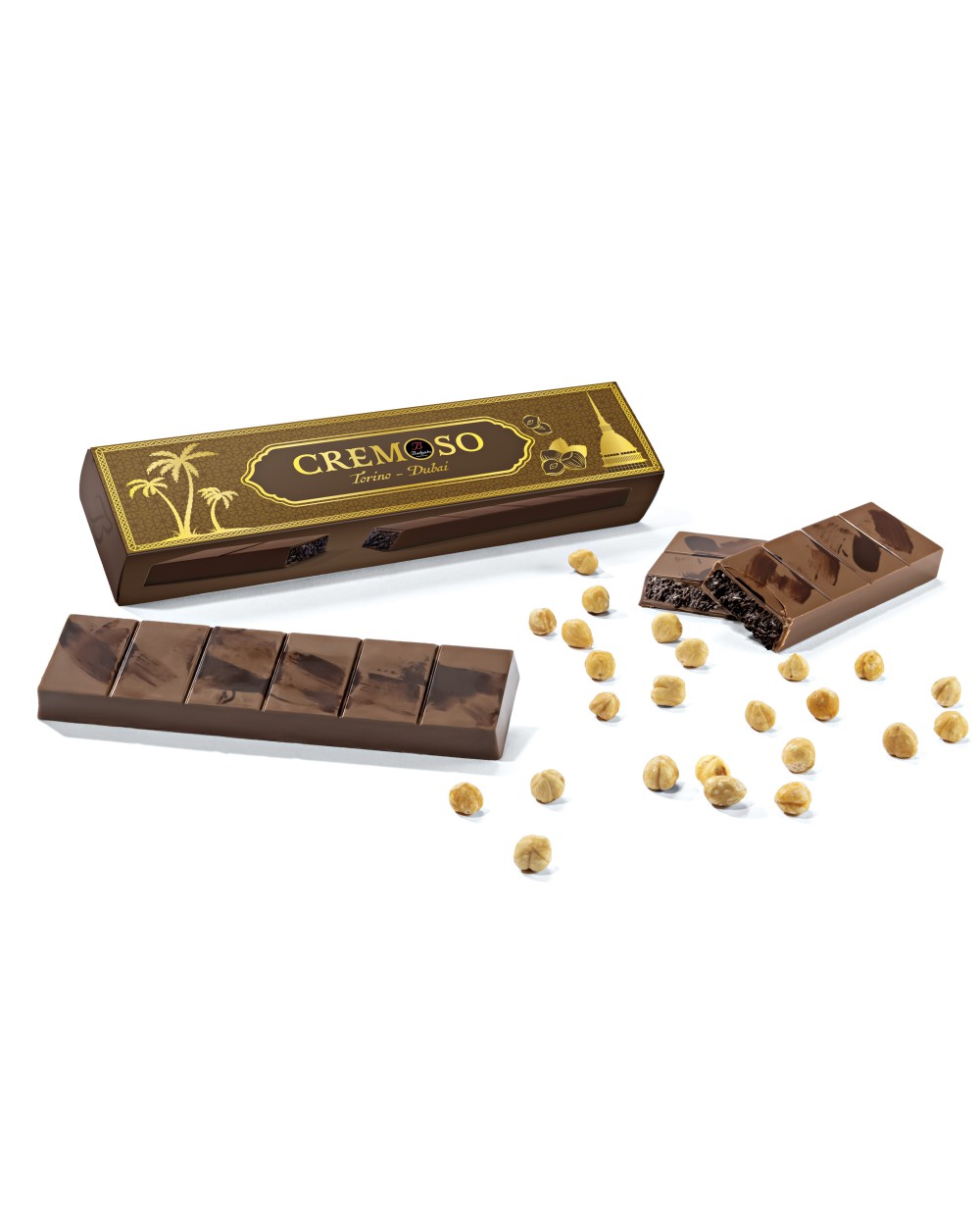 La nostra visione piemontese del Dubai chocolate: cioccolato fondente, ripieno gianduja e pasta kataifi per un equilibrio perfetto tra eleganza e intensità.