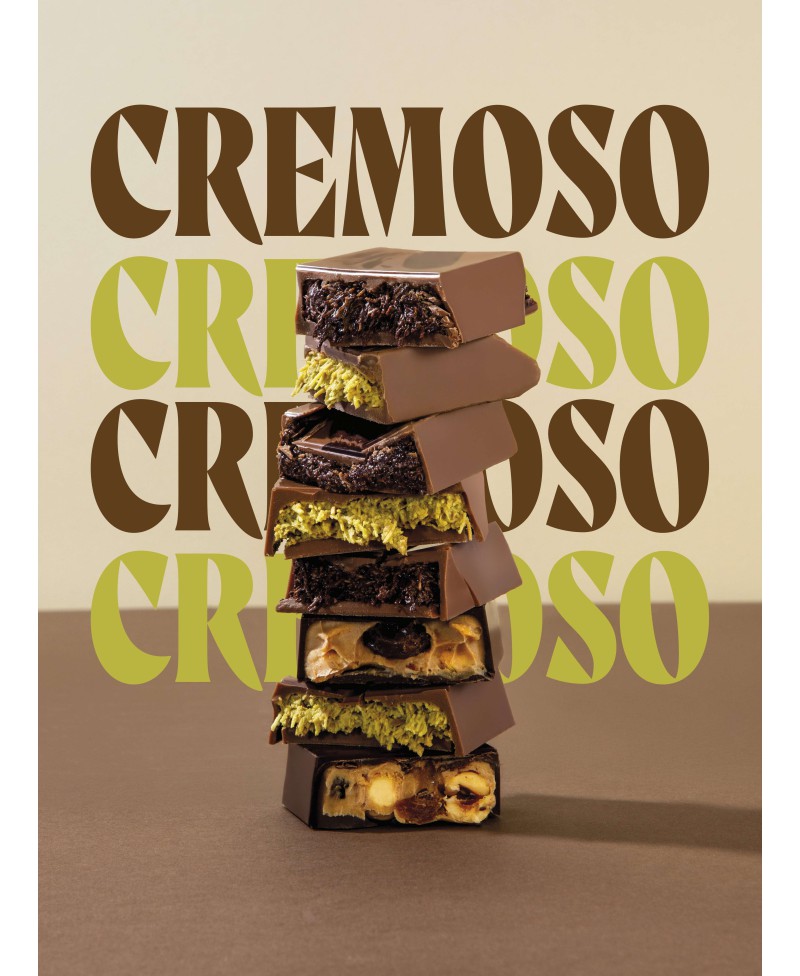 Un abbraccio ricco e avvolgente, cioccolato fondente con cuore di cremino alla nocciola, arricchito da nocciole intere, noci pecan, corn flakes e uvetta alla grappa!
